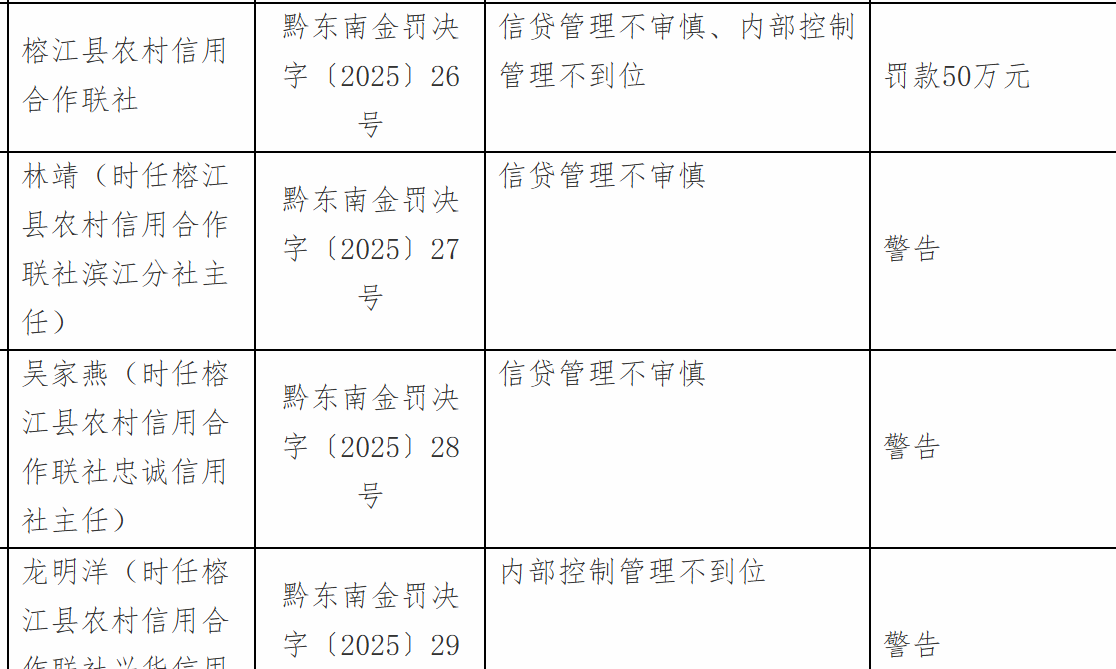 11月18日开云kaiyun,国度金融监督处置总局黔东南监管分局行政处罚信息公开表显现,榕江县农村信用互助联社因信贷处置不审慎、里面兑现处置不到位被罚金50万元;林某、吴某燕因信贷处置不审慎被劝诫,龙某洋因里面兑现处置不到位被劝诫。